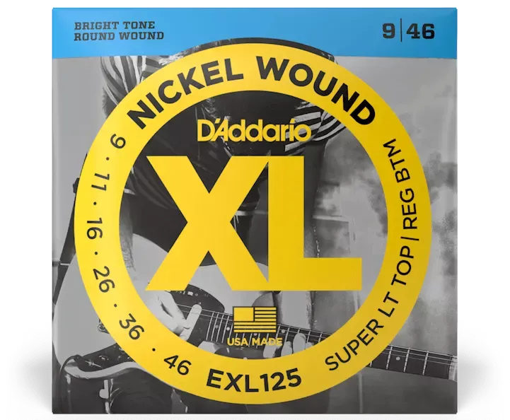 Struny pro elektrickou kytaru. Ocelové jádro, niklové vinutí. Super Light Top/Regular Bottom, 09-46. Výroba USA.